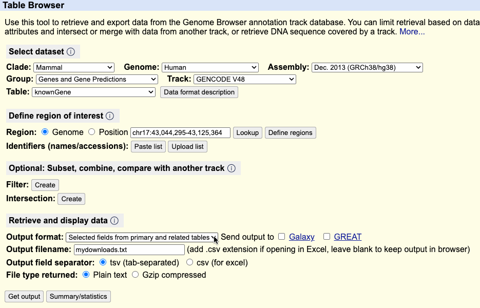 You can limit the output to a specific region or get data genome-wide. Whole-genome output may be unavailable for some tracks due to the large amount of data.
