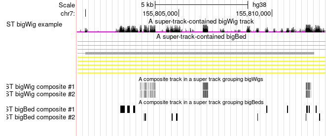 Configuring a basic super track is quite similar to composite tracks. There are two key components of a composite: (1) the line "superTrack on" in the parent track stanza, and (2) including "parent superTrackName" for each track that will be part of the super track.