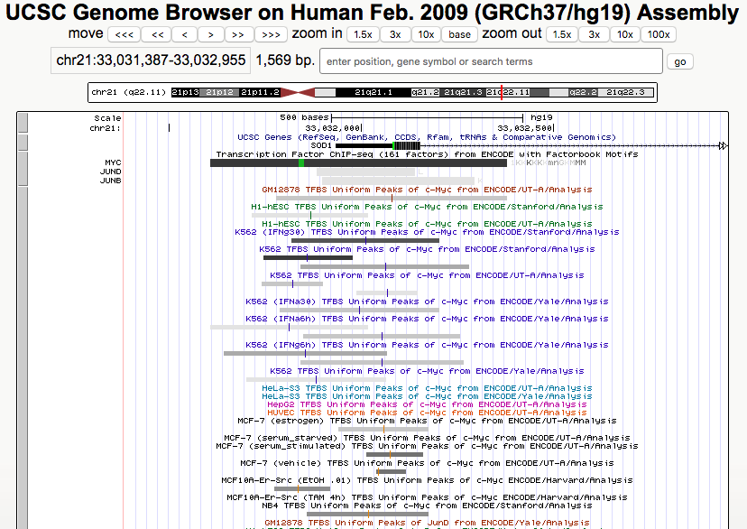 This session helps illustrate the process behind creating the TFBS Clusters track. Uniform processing resulted in a comparable signal scores viewable in the wgEncodeAwgTfbsUniform track, that was then used to generate the clustered score in the wgEncodeRegTfbsClusteredV3 track, where a normalization factor was used to attempt to better distribute scores evenly. The session originated from a question regarding whether it was correct to interpret the darker score as increased biological evidence of binding for a transcription factor at a particular spot. The response shared how by filtering to display only the JUN, JUNB, JUND, and MYC factors you can see several individual "Uniform ...c-Myc" tracks displayed below the clusters track. Those are the separate wgEncodeAwgTfbsUniform tracks used to generate the processed clustered summary wgEncodeRegTfbsClusteredV3 track for this MYC cluster. Those individual uniform processed scores were used to create the cluster score given to the MYC cluster. Like the MYC factor, you can also click the JUN factors and you will see there is only one observed cell type where this data indicates this factor binds at this location. And similarly below, you will see the "Uniform... Jun" tracks that contributed to the clusters track.