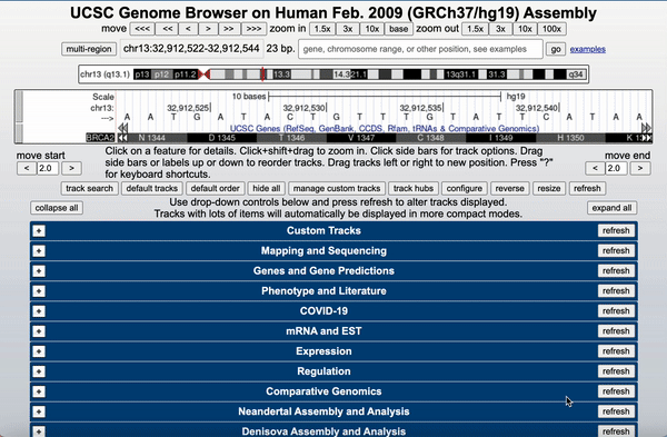Figure 1. Zoomed-in picture of BRCA2, exon 11 (frame is 23 nucleotides across). The DNA sequence is at the top. The "UCSC Genes" track shows corresponding amino acids. The lower tracks labeled, "All Short Genetic Variants from dbSNP Release 153" and "Simple Nucleotide Polymorphisms (dbSNP 151)", have show identified variant sites.